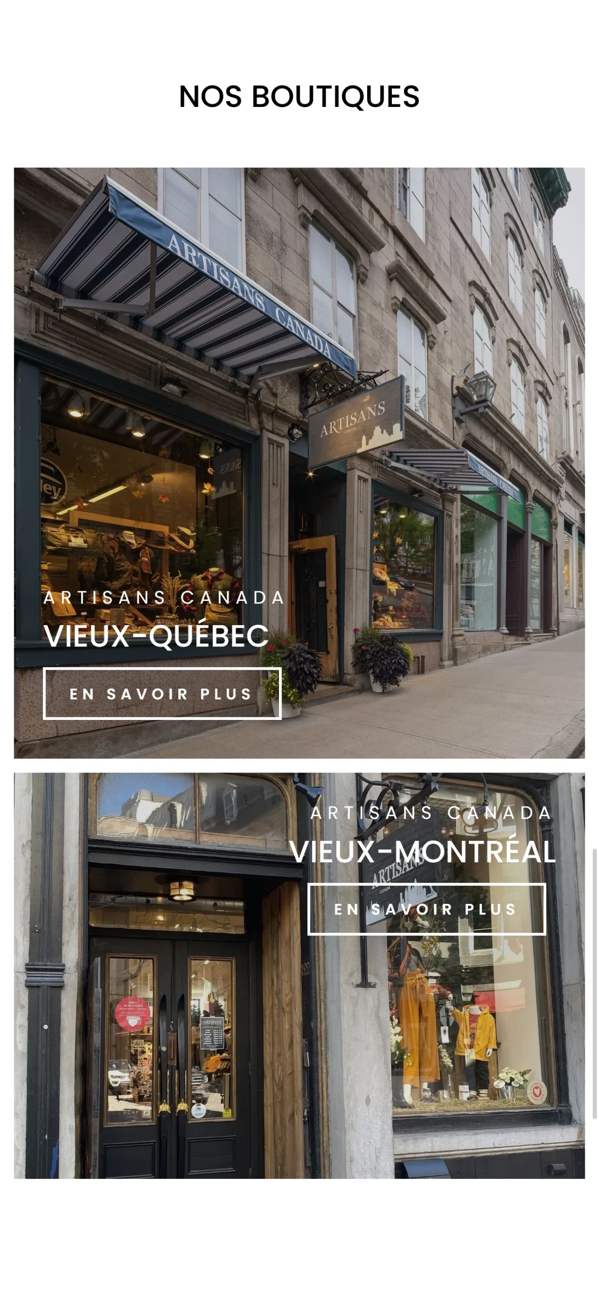 Artisans Canada est une boutique fondée en 1997 dans le Vieux-Québec, issue d’une entreprise existant depuis 1946, qui s’est réorientée vers la vente de vêtements tricotés avant d’évoluer vers le commerce d’objets variés. Sa mission : promouvoir le talent d’artisans et de créateurs canadiens, en offrant des produits faits au Canada ; vêtements, accessoires, objets déco, articles pour la maison, bijoux, etc.